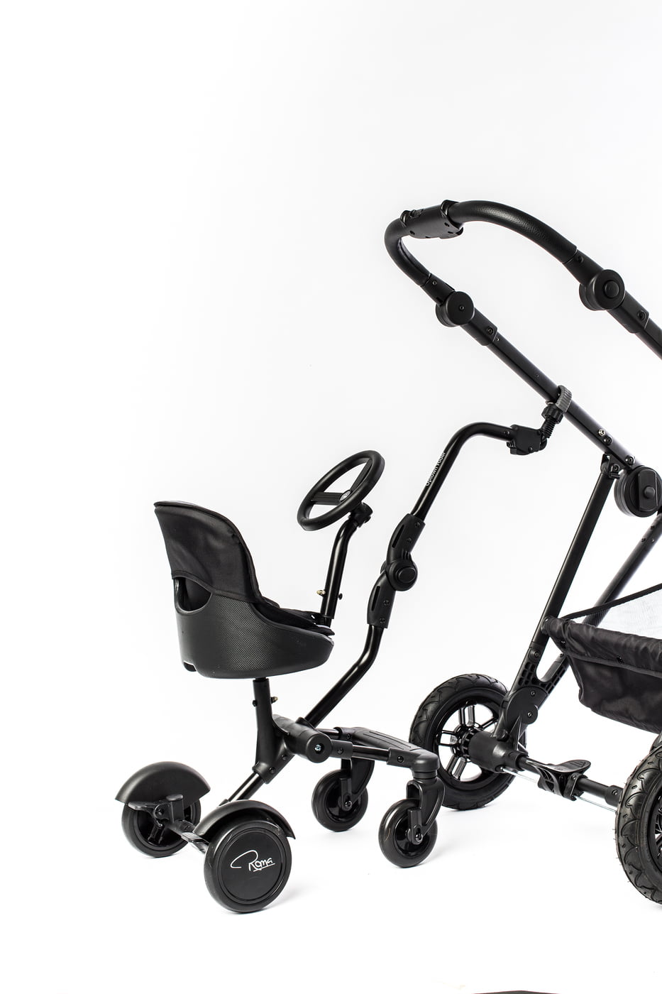 The Roma 4 Rider attaches to the axle of your pram and your child rides in front of you, whilst the Roma Uptown Rider attaches to the side of your pram chassis so your child rides to the side. Both have 4 wheels for extra stability.