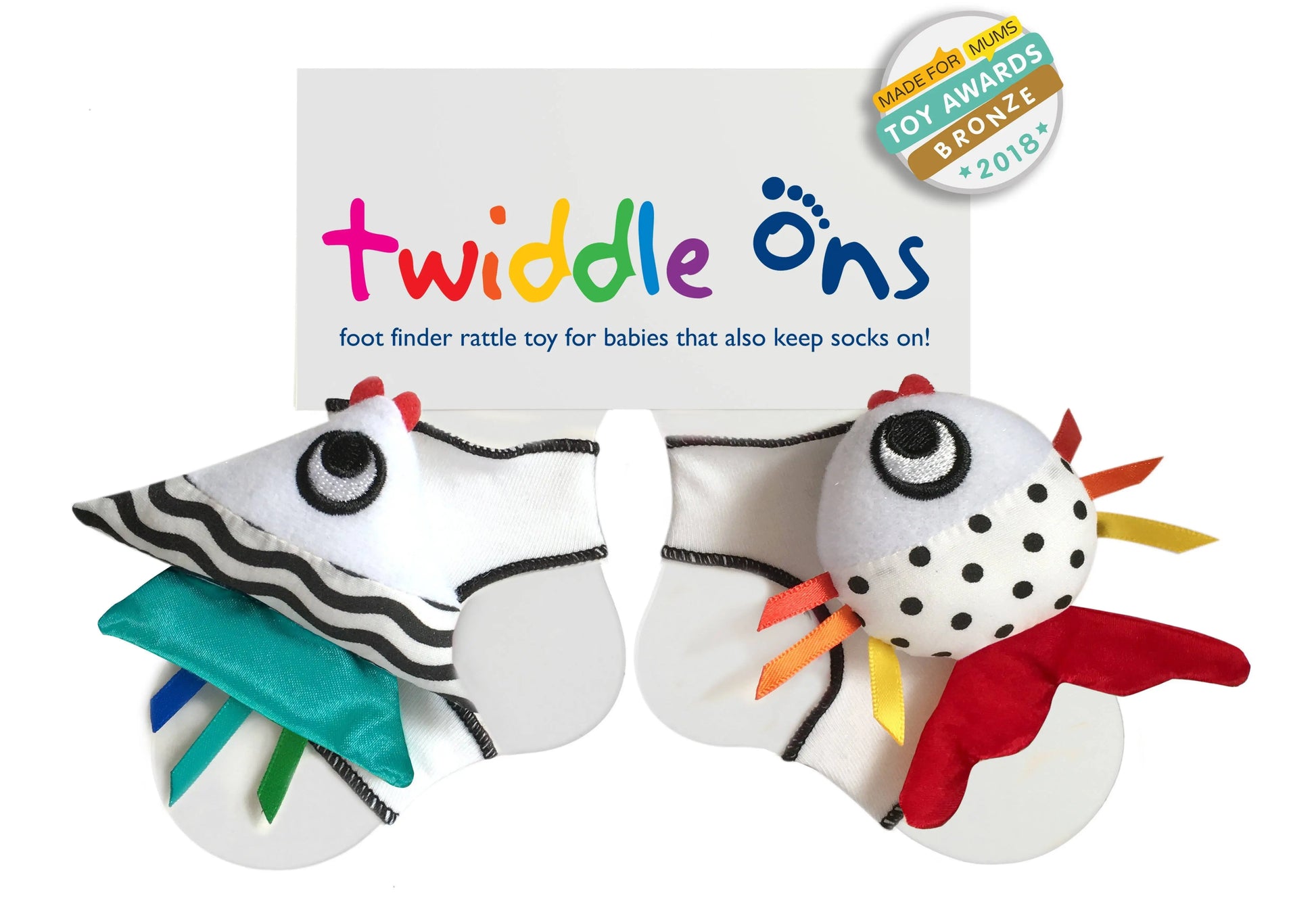 Babies are fascinated with their feet, so toys attached to their socks is a great idea except that up until now they would be pulled off in seconds. But not anymore! Following on the phenomenal global success of the multi award winning Sock Ons (clever little things that keep baby socks on), Twiddle Ons have been designed with toys attached to encourage babies to play with their feet keeping them entertained and engaged whilst the toys stay firmly in place.