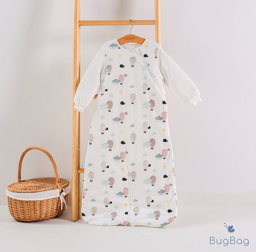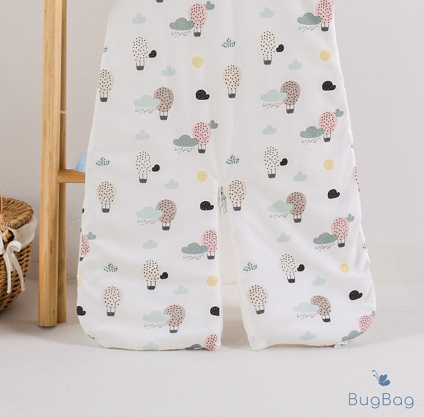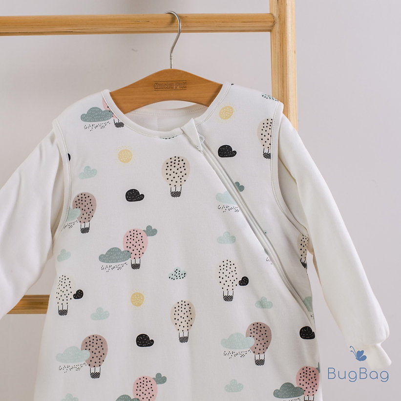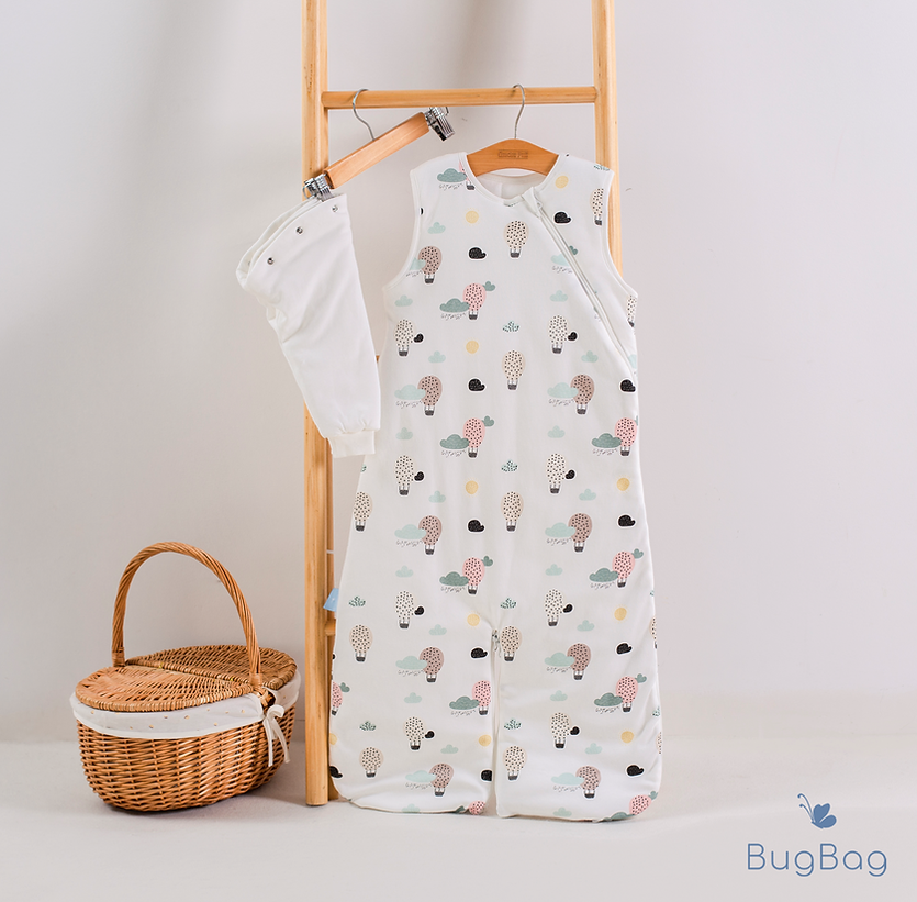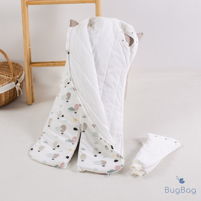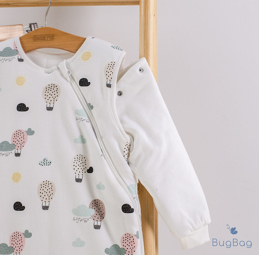 A super soft, luxurious cotton sleep bag with detachable sleeves. This BugBag transforms from a regular baby sleep bag into a jumpsuit, with a cleverly designed zip fastening at the bottom to separate the legs. This enables you to also use your BugBag in a baby carrier, pushchair and highchair. Perfect for transferring your sleeping baby straight into bed without disturbing them.